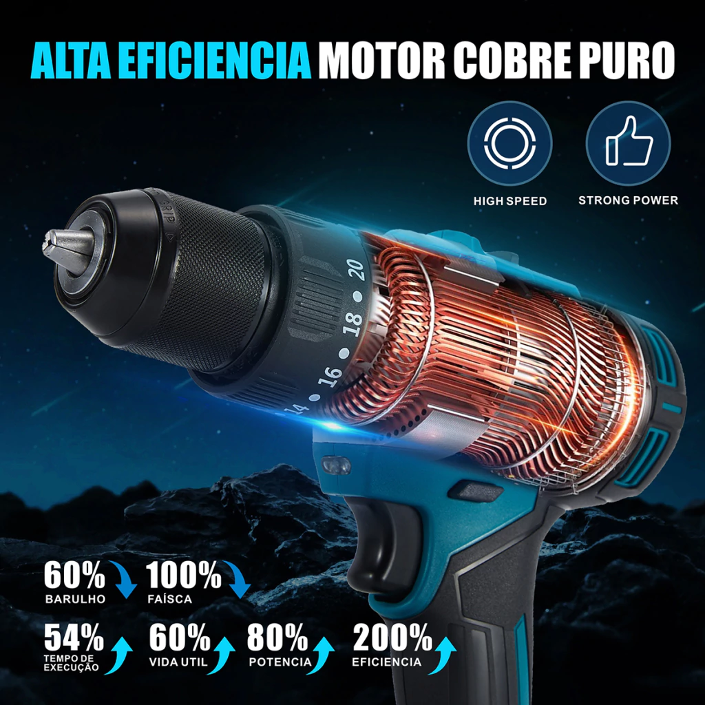 Potência do Motor: Velocidade variável de 0-450 / 0-1700 rpm, torque máximo de 80 N.m para perfurações rápidas e eficazes em diversos materiais.